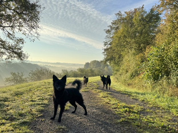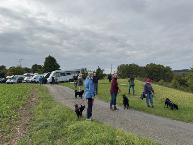 Für Samstag ist ein langer Spaziergang geplant (das berühmte „Soziale Laufen“). Doch das Wetter spielt verrückt: Orkantief Detlef sucht Schöntal mit Wind und Regen heim. Die Lösung liegt auf der Hand: Spaziergang vorziehen, dann ausgiebig brunchen, Kaffee trinken und Kuchen essen. Die Hunde haben trotzdem ihren Spaß – sie spielen miteinander, während ihre Menschen in jeder Regenpause Tricks, Spiele oder Gehorsamkeitsübungen mit ihnen zeigen. Abends begeistert Ute Frank mit einem kurzweiligen Vortrag zum Hundesport, bei dem jeder herausfinden kann, welche Sportart zu ihm und seinem Vierbeiner passt. Mira Gehring, unsere Hauptzuchtwartin, nutzt das gemeinsame Abendessen, um Ute Frank für die fantastische Organisation und ihren Einsatz für die Mudis zu danken. Ute bedankt sich und betont, wie wichtig die Zusammenarbeit aller Mudizüchter ist, damit die Rasse bekannter wird und die Aufmerksamkeit erhält, die sie verdient. Bis in die späte Nacht wird gefeiert – nur die Mudis sind da schon längst im Land der Träume.
