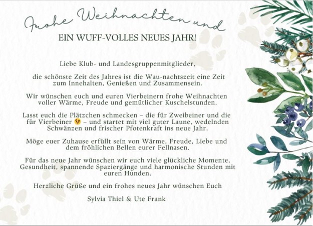 Ein neues Jahr heißt neue Hoffnung, neue Gedanken und neue Wege zum Ziel. Aus diesem Grund wünsche ich den Klubmitgliedern sowie allen Liebhabern unserer Hunderassen einen guten Start ins neue Jahr.