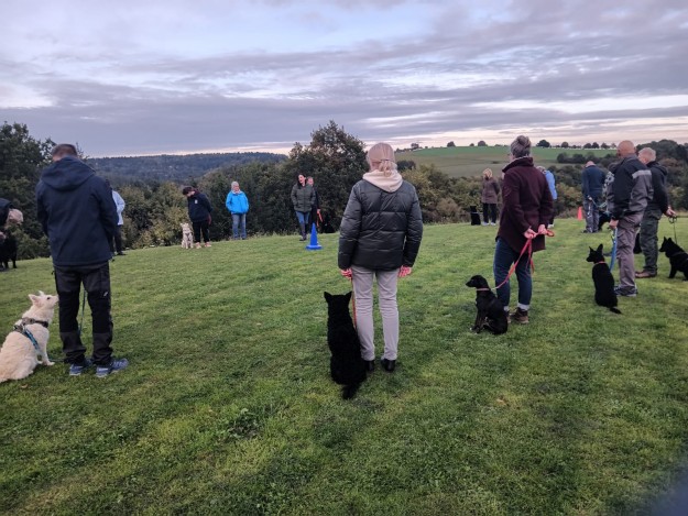 Für Samstag ist ein langer Spaziergang geplant (das berühmte „Soziale Laufen“). Doch das Wetter spielt verrückt: Orkantief Detlef sucht Schöntal mit Wind und Regen heim. Die Lösung liegt auf der Hand: Spaziergang vorziehen, dann ausgiebig brunchen, Kaffee trinken und Kuchen essen. Die Hunde haben trotzdem ihren Spaß – sie spielen miteinander, während ihre Menschen in jeder Regenpause Tricks, Spiele oder Gehorsamkeitsübungen mit ihnen zeigen. Abends begeistert Ute Frank mit einem kurzweiligen Vortrag zum Hundesport, bei dem jeder herausfinden kann, welche Sportart zu ihm und seinem Vierbeiner passt. Mira Gehring, unsere Hauptzuchtwartin, nutzt das gemeinsame Abendessen, um Ute Frank für die fantastische Organisation und ihren Einsatz für die Mudis zu danken. Ute bedankt sich und betont, wie wichtig die Zusammenarbeit aller Mudizüchter ist, damit die Rasse bekannter wird und die Aufmerksamkeit erhält, die sie verdient. Bis in die späte Nacht wird gefeiert – nur die Mudis sind da schon längst im Land der Träume.